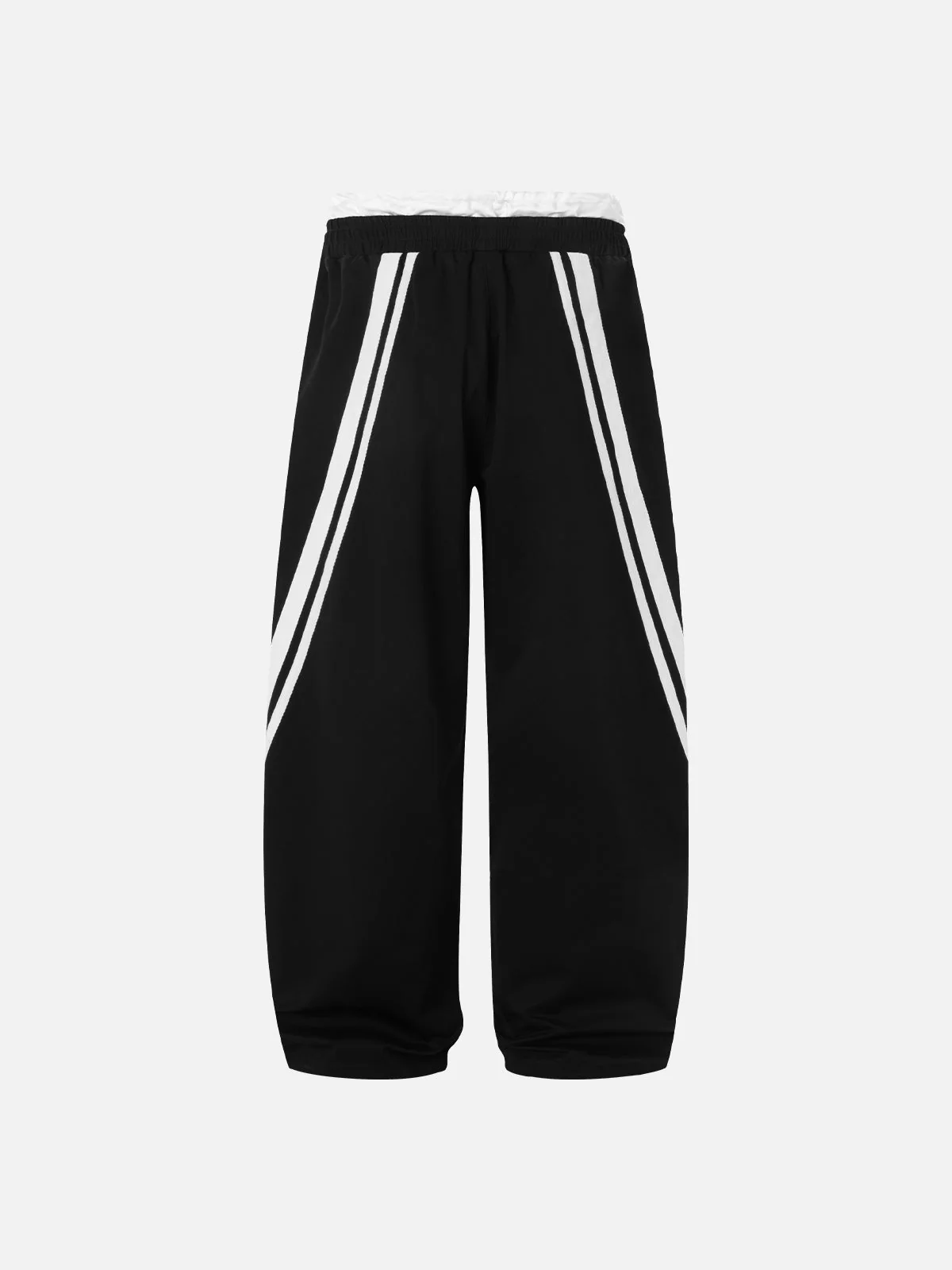Step into layered detail with these black and white contrast sweatpants featuring a unique double waistband design. The illusion of two waistbands adds depth and attitude, while the bold monochrome blocking keeps the look sharp and graphic.